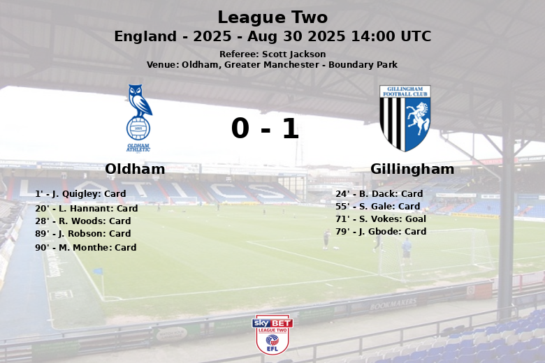 Oldham, Greater Manchester – In a hard-fought match at Boundary Park, Gillingham secured a valuable away victory against Oldham in the sixth round of League Two. The match, officiated by Scott Jackson, was marked by intensity and numerous cautions. Oldham dominated possession with 56%, but failed to convert it into goals. The first half was a midfield battle, with constant interruptions and a flurry of yellow cards for both teams. Oldham accumulated five cards (J. Quigley, L. Hannant, R. Woods, J. Robson, and M. Monthe) while Gillingham received three (B. Dack, S. Gale, and J. Gbode). Despite having more shots (10 vs. 8) and more corners (7 vs. 2), Oldham’s effectiveness in front of goal was poor, with only three shots on target. The winning goal for Gillingham came in the 71st minute when S. Vokes capitalized on an assist from M. Clark to beat the home goalkeeper. Gillingham, with 44% possession, took their chance and defended their lead until the end. The high number of fouls committed by Gillingham (16 vs. Oldham’s 10) reflected the intensity of the match and their struggle to secure the three points.