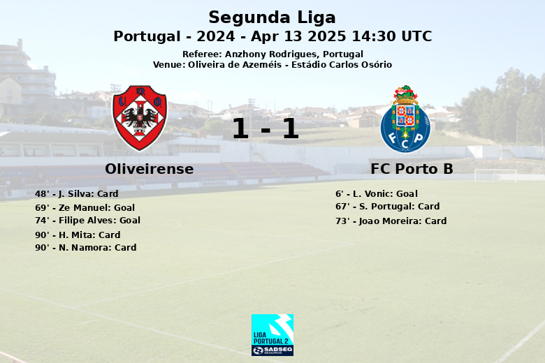 Oliveira de Azeméis hosted a thrilling encounter between Oliveirense and FC Porto B in the 29th round of the Portuguese Segunda Liga. Although FC Porto B took the lead early with a goal from L. Vonic in the 6th minute, Oliveirense staged a remarkable comeback in the second half. The home team reacted strongly after the break, scoring two goals late in the game. Ze Manuel scored a penalty (although initially missed) in the 69th minute, and Filipe Alves sealed the victory in the 74th minute. The match was marked by tension, with three yellow cards for Oliveirense and two for FC Porto B. The victory puts Oliveirense in a good position in the table, while FC Porto B will need to recover from this defeat.