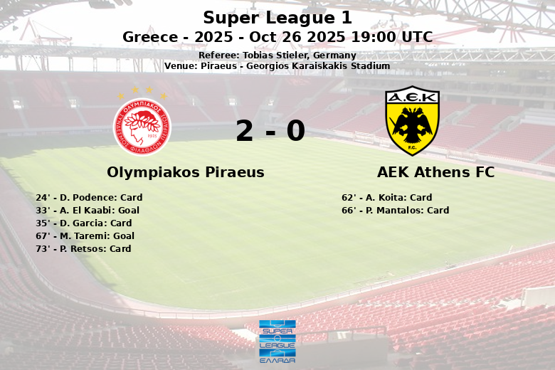 Olympiakos opened the scoring in the 33rd minute thanks to a penalty converted by A. El Kaabi. The match became tense, reflected in the yellow cards shown to D. Podence and D. Garcia of Olympiakos in the first half. The second half continued with a similar pace, with yellow cards for A. Koita and P. Mantalos of AEK. In the 67th minute, M. Taremi extended the lead for Olympiakos, with an assist from D. Podence, sealing the final result. The game was constantly interrupted by fouls, with 9 committed by Olympiakos and 17 by AEK. Although AEK tried to react, Olympiakos’ solid defense prevented them from scoring.