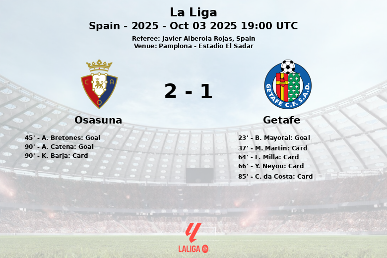 The decisive moment came in added time. In the 90th minute, A. Catena scored the winning goal for Osasuna, assisted by R. Garcia, unleashing euphoria in the stands of the Estadio El Sadar. Despite Getafe’s six shots, only two were on target, showing Osasuna’s defensive solidity in the second half. Osasuna, with 7 total shots (3 on target), knew how to take advantage of their opportunities at key moments of the match. Referee Javier Alberola Rojas officiated the match.