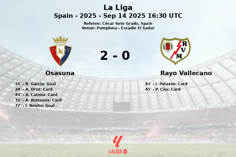 Pamplona, Spain – Osasuna secured a solid victory against Rayo Vallecano at Estadio El Sadar in a match corresponding to the fourth round of La Liga. Despite Rayo Vallecano dominating possession with 64%, it was Osasuna who showed greater effectiveness in front of goal.