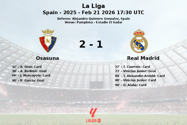 The match began with intensity, reflected in the yellow cards shown to A. Oroz for Osasuna in the 32nd minute and to T. Courtois for Real Madrid in the 37th. Shortly after, in the 38th minute, A. Budimir put Osasuna ahead with a penalty goal.
