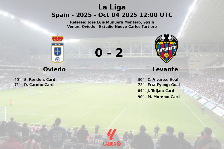In the second half, Levante extended their lead in the 72nd minute with a goal from Etta Eyong, without an assist. Despite Oviedo’s efforts to find the back of the net, they only managed one shot on target out of the ten they attempted. Levante, on the other hand, managed five shots on target out of the thirteen total. The referee issued four yellow cards in the match, two for Oviedo and two for Levante. The match concluded with a score that reflects Levante’s greater effectiveness, who knew how to take advantage of their opportunities to take all three points home. The match was officiated by José Luis Munuera Montero.