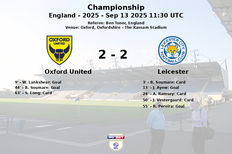 The match started intensely, reflected in the yellow card for Leicester’s B. Soumare in the 3rd minute. Oxford United quickly took the lead in the 9th minute thanks to a goal from W. Lankshear, assisted by M. Helik. Leicester responded in the 13th minute with a goal from J. Ayew. Tension rose when Leicester’s A. Ramsey received a red card in the 24th minute, leaving his team with ten men. Just before halftime, Oxford United regained the lead with an own goal by B. Soumare in the 44th minute.