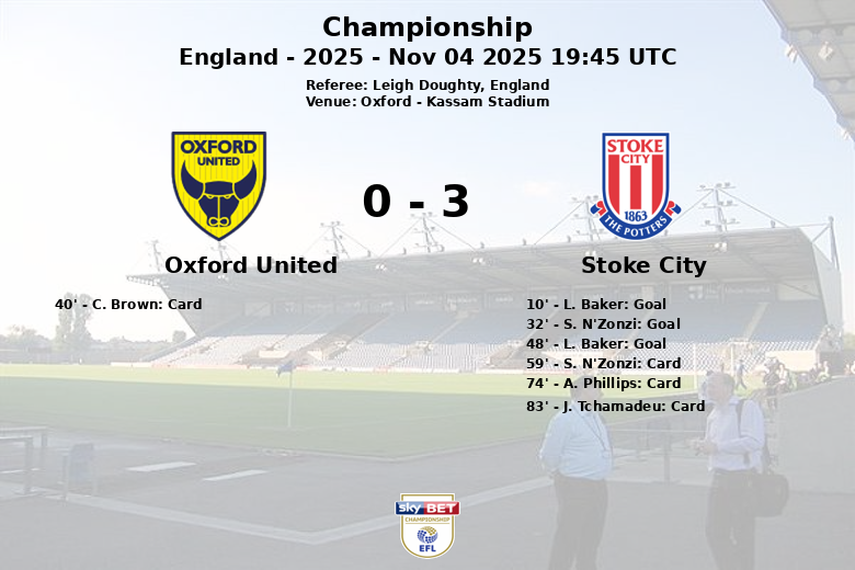 In a match held at Oxford’s Kassam Stadium, Stoke City demonstrated their superiority by defeating Oxford United with a convincing performance. From the outset, the visiting team imposed their game rhythm. L. Baker opened the scoring in the 10th minute with a goal, followed by S. N’Zonzi in the 32nd minute, assisted by L. Baker, extending the lead before halftime. C. Brown from Oxford United received a yellow card in the 40th minute.