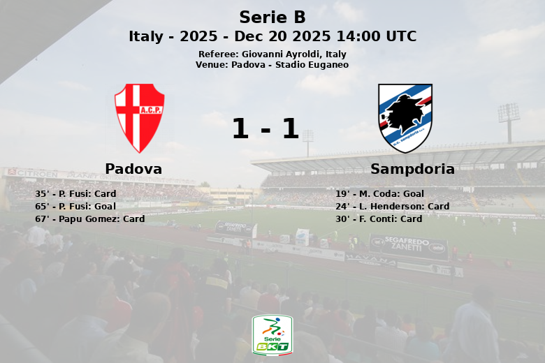 Padova, Italy – In a hard-fought match at the Stadio Euganeo, Padova and Sampdoria drew in a vibrant and eventful game. Sampdoria struck first in the 19th minute, when M. Coda, assisted by F. Depaoli, found the net with an accurate shot. However, Padova, spurred on by their fans and greater ball possession (65%), managed to equalize in the 65th minute thanks to P. Fusi, who capitalized on an assist from M. Bortolussi.