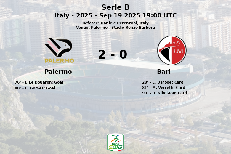 The second half was where the action unfolded. J. Le Douaron opened the scoring for Palermo in the 76th minute, after a play with no assist recorded. Bari tried to respond, but their offensive efforts were insufficient, as none of their shots managed to be directed between the three posts. M. Verreth from Bari received a yellow card in the 81st minute and D. Nikolaou from Bari also received a yellow card in the 90th minute.