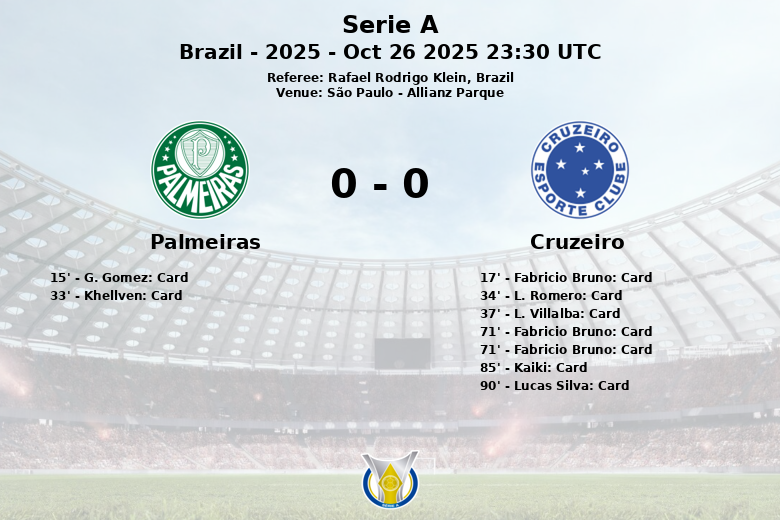 São Paulo, Brazil – The match between Palmeiras and Cruzeiro at the Allianz Parque, corresponding to matchday 30 of Serie A, concluded in a goalless draw in a tense and contested match. Referee Rafael Rodrigo Klein had a busy night, showing a total of eight yellow cards and one red card.
