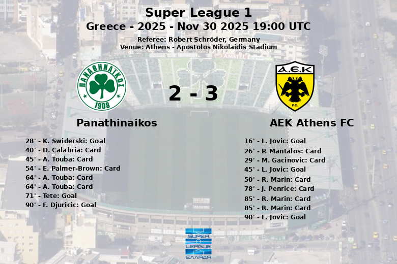 Panathinaikos responded with tenacity. Despite K. Swiderski missing a penalty in the 28th minute, Tete equalized in the 71st minute with a goal assisted by A. Zaroury. F. Djuricic made it 3-2 in the 90th minute, with an assist from M. Pantovic. However, a penalty in added time for AEK, again converted by Jovic, secured the final draw.