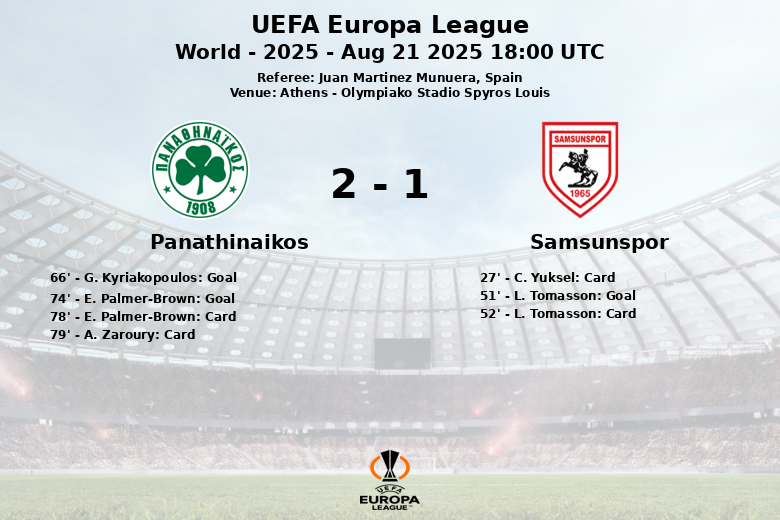 The match was hotly contested, reflected in the yellow cards shown to E. Palmer-Brown (78′) and A. Zaroury (79′) of Panathinaikos. In terms of statistics, Panathinaikos took 10 shots, of which 5 were on target, while Samsunspor took 7, with 3 directed at the goal. Panathinaikos generated 8 corners compared to Samsunspor’s 4. Spanish referee Juan Martinez Munuera controlled the match, which ended with a victory for Panathinaikos in this first leg of the UEFA Europa League Play-offs.