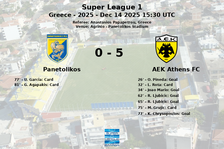 In the second half, AEK maintained its dominance, extending its lead with two goals by R. Ljubicic (62′ and 65′). The offensive exhibition culminated with a goal by K. Chrysopoulos in the 77th minute, assisted by N. Eliasson. Panetolikos, despite their efforts, could only generate 5 shots, none of them on target. The match also had moments of tension, with yellow cards for U. Garcia and G. Agapakis of Panetolikos, and for M. Grujic of AEK. Overall, AEK Athens demonstrated a clear superiority, both in possession and in effectiveness in front of goal.