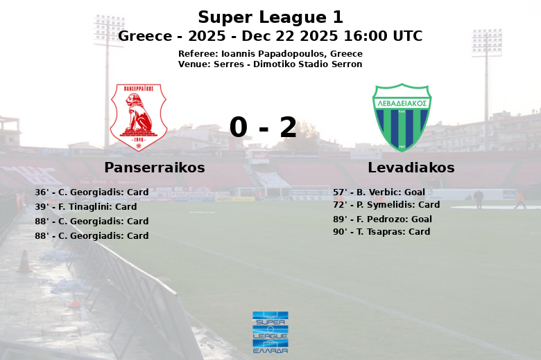 Serres, Greece – In a match held at the Dimotiko Stadio Serron, Levadiakos defeated Panserraikos with a score of two to zero in a game corresponding to matchday 15 of Super League 1. The home team, with only 37% possession, saw their options diminished after the expulsion of F. Tinaglini in the 39th minute. Despite a defensive effort, Levadiakos, which controlled 63% of the ball, opened the scoring in the 57th minute thanks to a goal by B. Verbic, assisted by T. Tsapras. Panserraikos suffered a heavy blow by being left with nine players after the expulsion of C. Georgiadis in the 88th minute. In the final minutes, F. Pedrozo sealed the match in the 89th minute with an assist from S. Palacios, consolidating Levadiakos’ victory. The match, refereed by Ioannis Papadopoulos, was marked by intensity, reflected in the multiple cards shown, two of them red for Panserraikos. Levadiakos demonstrated their superiority with 16 shots, of which 6 were on target, contrasting with Panserraikos’ only shot on target in their 8 attempts.