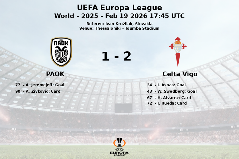 The match was marked by intensity, reflected in the yellow cards shown to H. Alvarez and J. Rueda for Celta Vigo, and to A. Zivkovic for PAOK. Although PAOK dominated possession and generated 3 corner kicks, Celta Vigo proved to be more effective in attack, with 10 total shots, 9 of which were on target. Slovakian referee Ivan Kružliak controlled the game in a vibrant atmosphere at the Toumba Stadium. Celta Vigo returns home with a crucial advantage for the second leg.