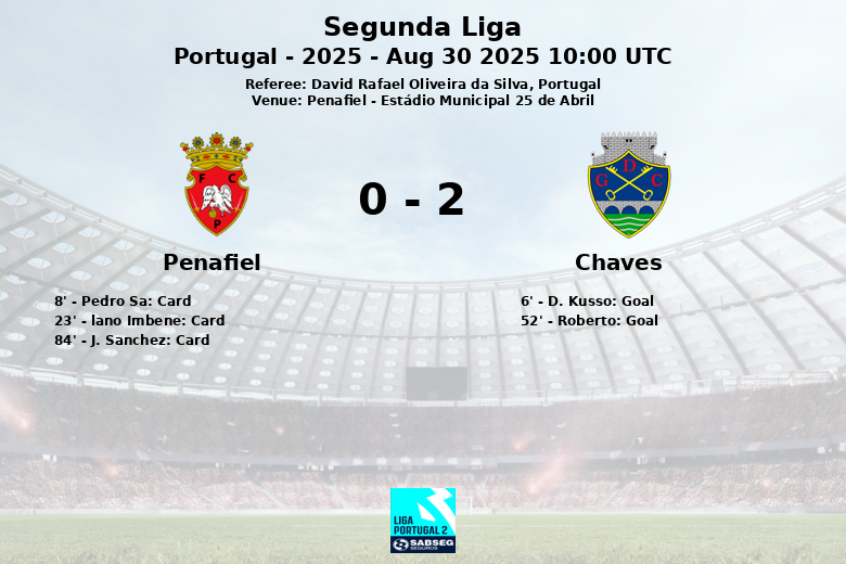 D. Kusso opened the scoring for Chaves just in the 6th minute, following an assist from R. Alves, setting the pace for the match. Penafiel tried to react, but were hindered by early yellow cards to Pedro Sa (minute 8) and Iano Imbene (minute 23).