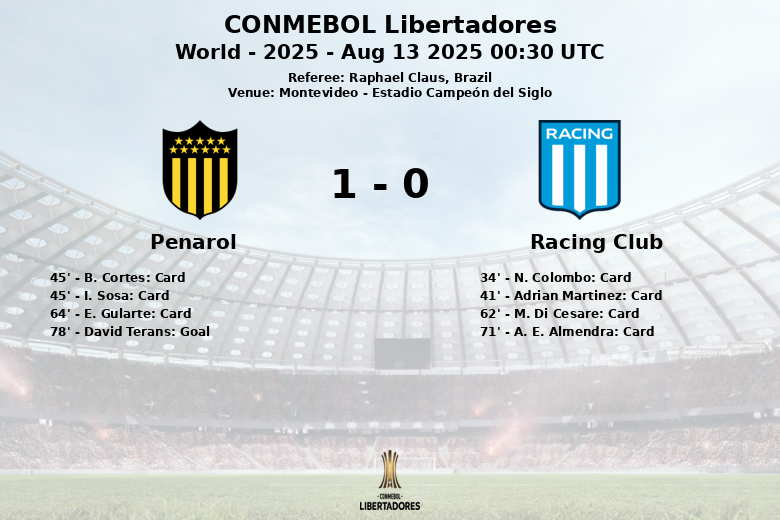 Racing Club dominated possession with 54%, but failed to convert that dominance into clear goal-scoring opportunities. Of their nine shots, none found the target. Peñarol, on the other hand, was more effective, capitalizing on one of the three clear chances they created. The winning goal came in the 78th minute, scored by David Terans with an assist from M. Arezo.