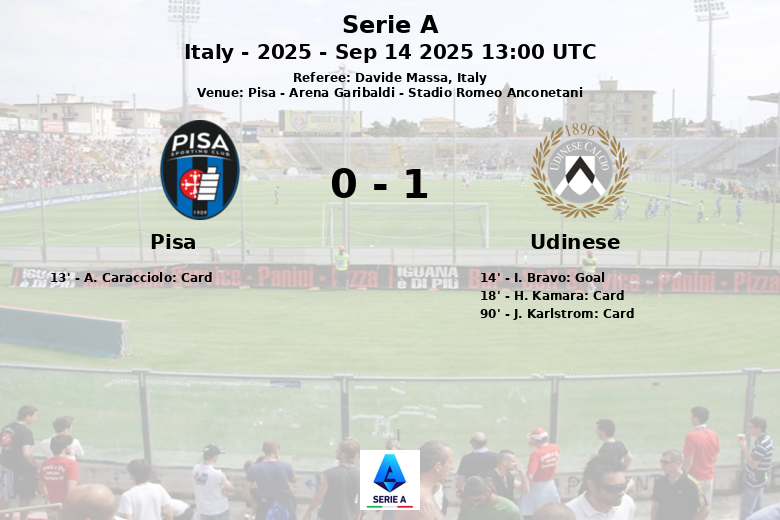 Despite taking 12 shots, only 2 of Pisa’s were on target, while Udinese, with 13 total shots, directed 3 on target. The contest was also physical, with 13 fouls committed by Pisa and 15 by Udinese. A. Caracciolo of Pisa received a yellow card in the 13th minute, while H. Kamara (minute 18) and J. Karlstrom (minute 90) were booked for Udinese. The match concluded with the score favouring Udinese.