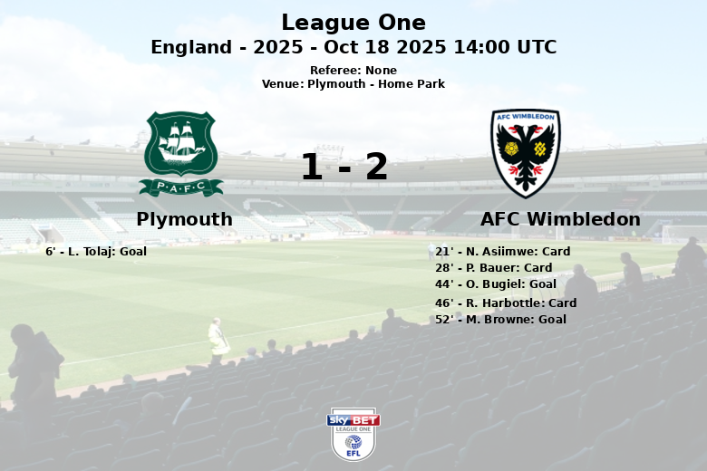 The second half began with intensity. R. Harbottle received a yellow card in the 46th minute. M. Browne put AFC Wimbledon ahead in the 52nd minute, thanks to an assist from J. Reeves. Plymouth had a slight advantage in shots on target (4 vs 2) and corners (10 vs 2).