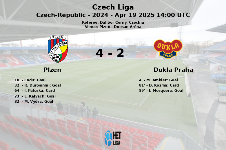 Viktoria Plzeň achieved a resounding 4-1 victory over Dukla Praha at the Doosan Aréna in Plzeň. The match, part of the Czech Liga’s 30th round, was dominated by the home side. Plzeň took the lead early with a goal from Cadu in the 10th minute, assisted by P. Sulc. R. Durosinmi extended the lead in the 32nd minute, assisted by L. Kalvach. Dukla Praha pulled one back with a goal from M. Ambler in the 4th minute, but Plzeň asserted their dominance in the second half. L. Kalvach scored Plzeň’s third goal in the 73rd minute, again assisted by P. Sulc, and M. Vydra added a fourth in the 82nd minute, assisted by P. K. Adu. J. Mosquera scored a late goal for Dukla in the 89th minute, but it proved too little, too late. Plzeň controlled possession (56%) and had 15 shots (5 on target), while Dukla Praha managed 8 shots (2 on target). Both teams received one yellow card each.