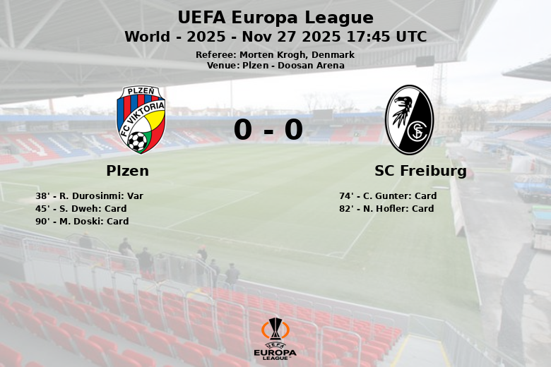 The match was plagued with fouls, 15 committed by Plzen and 11 by SC Freiburg, which resulted in a total of four yellow cards shown by referee Morten Krogh, two for each team. Plzen had 7 corner kicks in their favor, while SC Freiburg had 3. Despite the efforts of both teams, the score remained unchanged, leaving one point for each in the standings.