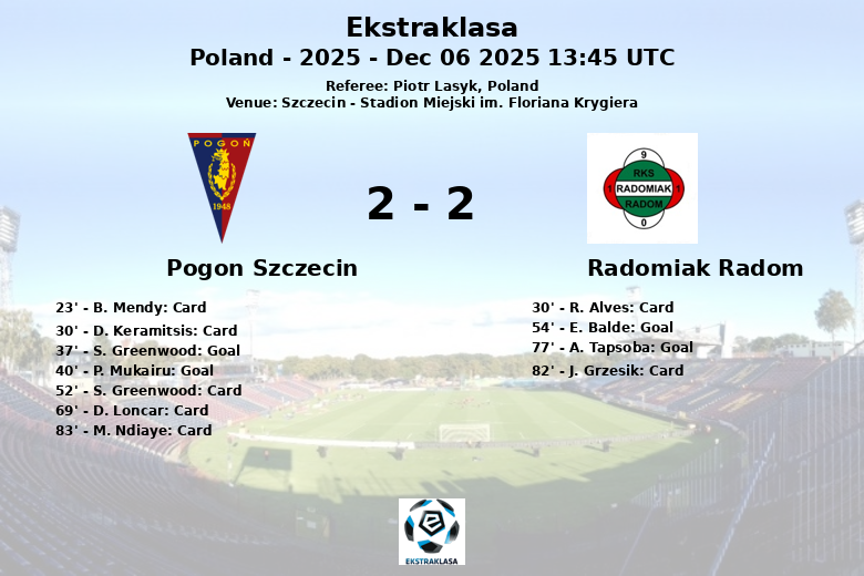 Radomiak pulled one back in the 54th minute with a goal from E. Balde, assisted by J. Grzesik, and finally leveled the score in the 77th minute with a goal from A. Tapsoba, following an assist from J. Wilson-Esbrand. Despite the effort and opportunities created, both teams shared the points in a match that kept the fans on the edge of their seats. Pogon took 13 shots, only 3 of which were on target, while Radomiak had 10 shots with 5 on target.