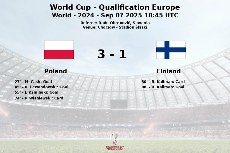 In the second half, Poland continued to dominate. J. Kaminski, this time assisted by R. Lewandowski, scored the third goal in the 55th minute, solidifying the victory. Finland managed to pull one back in the final minutes with a goal from B. Kallman in the 88th minute, but it was not enough to change the course of the match.
