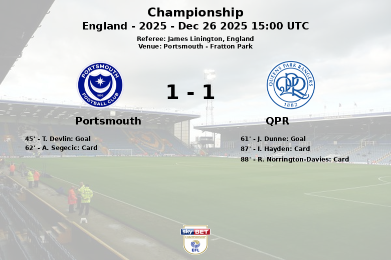 Portsmouth and Queens Park Rangers played to a draw in a vibrant encounter at Fratton Park. Portsmouth dominated possession with 66% of the ball, but couldn’t convert it into a victory. The match started favorably for the home team when T. Devlin scored in the 45th minute, however, QPR responded in the second half with a goal by J. Dunne in the 61st minute, assisted by N. Madsen.