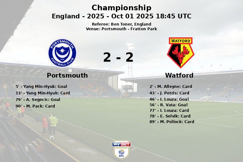 Portsmouth, England – In a hard-fought match at Fratton Park, Portsmouth and Watford played to a two-all draw in the eighth round of the Championship. The game, officiated by Ben Toner, was characterized by intensity and numerous yellow cards.