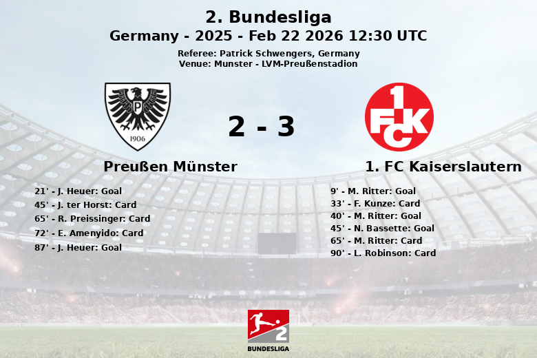 Münster, Germany – In a vibrant and hard-fought match at the LVM-Preußenstadion, 1. FC Kaiserslautern emerged victorious against Preußen Münster on matchday 23 of the 2. Bundesliga. The game, officiated by Patrick Schwengers, was marked by intensity and numerous cautions.