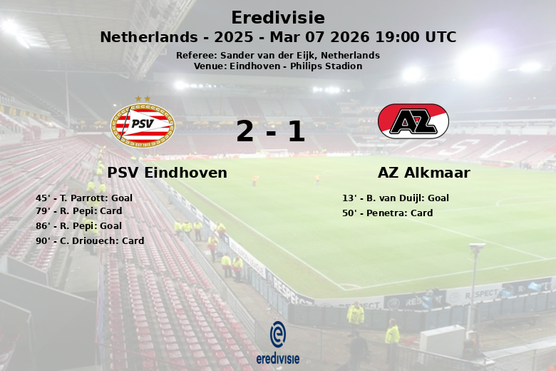 Eindhoven, Netherlands – In a hard-fought match at the Philips Stadion, PSV Eindhoven secured a crucial victory over AZ Alkmaar, albeit after a challenging start. AZ Alkmaar took an early lead with a goal by B. van Duijl in the 13th minute, assisted by I. Jensen, putting the home side on the back foot. PSV managed to equalize just before halftime thanks to an own goal by T. Parrott in the 45th minute.