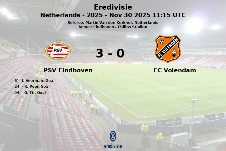 In the second half, PSV continued to press forward. Guus Til scored the third goal in the 54th minute, assisted by Emirhan Bajraktarevic, sealing a convincing victory. Despite FC Volendam’s efforts, who had 38% possession and 10 shots, only two of these were on target, showcasing PSV’s defensive solidity. The match, refereed by Martin Van den Kerkhof, proceeded without any yellow or red cards. PSV Eindhoven demonstrated their offensive prowess and control of the game, solidifying their position as a strong contender in the Eredivisie.