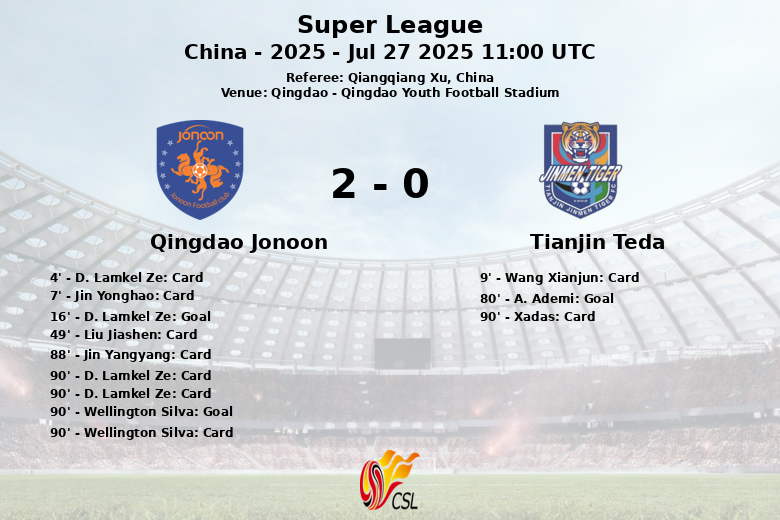Qingdao, China – Qingdao Jonoon prevailed over Tianjin Teda in a Chinese Super League match held at the Qingdao Youth Football Stadium, culminating in a score of 2 to 1. The match, refereed by Qiangqiang Xu, was marked by intensity and numerous cautions.