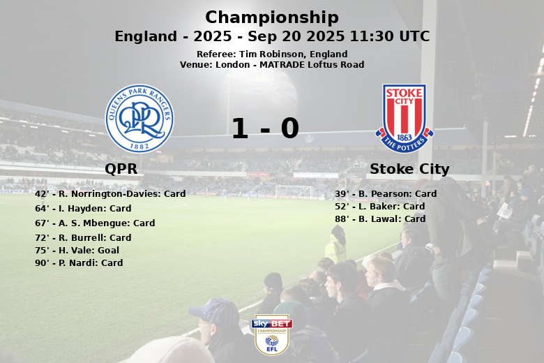 In a hard-fought match at MATRADE Loftus Road in London, QPR emerged victorious against Stoke City with a final score of 1 to 0. The game, part of the sixth round of the 2025 Championship regular season, was notable for its high intensity and physical play, reflected in the number of cards issued by referee Tim Robinson.