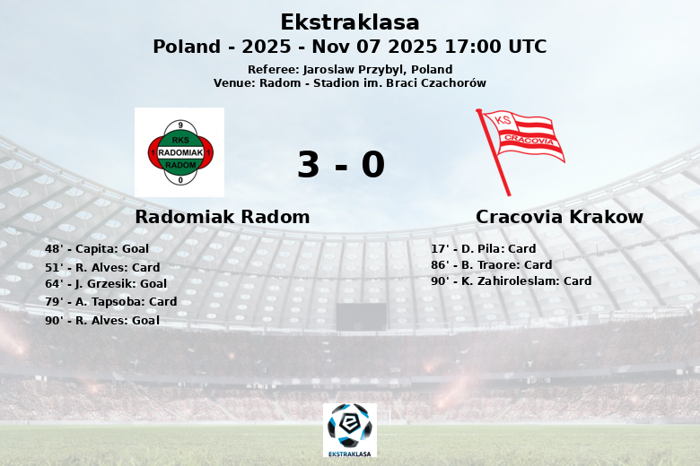 Referee Jaroslaw Przybyl had a challenging task officiating a match with a high number of fouls and cautions. The match made clear Radomiak Radom’s dominance at home, solidifying their position in the Ekstraklasa.
