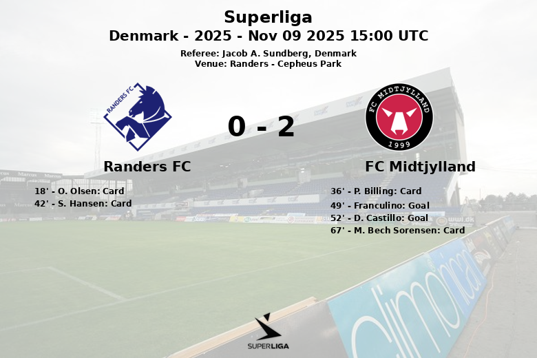 The first half was marked by yellow cards, with O. Olsen and S. Hansen being cautioned for Randers FC and P. Billing for FC Midtjylland. However, the second half brought the goals. Franculino opened the scoring for FC Midtjylland in the 49th minute, following an assist from A. Simsir. Just three minutes later, D. Castillo extended the lead for the visiting team, setting the final score at 0-2.