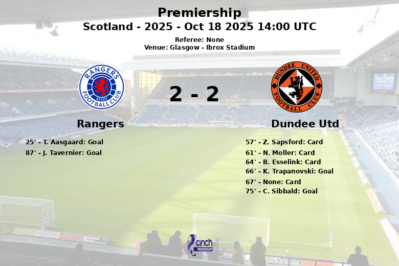 The first goal of the match came in the 25th minute when T. Aasgaard, assisted by D. Gassama, opened the scoring for Rangers. Dundee Utd, despite having only 31% possession, managed to equalize in the 66th minute thanks to K. Trapanovski. However, the joy was short-lived for the visitors, as C. Sibbald put Dundee Utd ahead in the 75th minute. When it seemed that a draw was imminent, J. Tavernier scored the winning goal for Rangers in the 87th minute, securing all three points for his team.