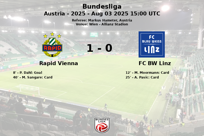 Vienna, Austria – Rapid Vienna kicked off the 2025 Bundesliga season with a hard-fought victory over FC BW Linz at the Allianz Stadion. The only goal of the match came early on, in the 8th minute, when P. Dahl capitalized on an assist from J. Antiste to put the home side ahead.