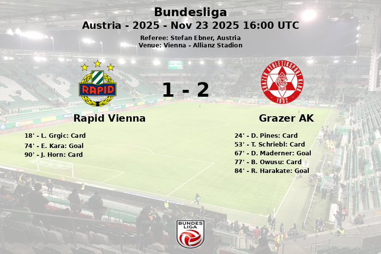 Just when it seemed that Rapid Vienna might take the victory, R. Harakate of Grazer AK scored a goal in the 84th minute, assisted by M. Satin, tying the match again and sealing the final result. Despite Rapid Vienna’s dominance in possession and their 10 shots, Grazer AK’s effectiveness in front of the goal was crucial to securing the draw. The match was also marked by yellow cards received by T. Schriebl and B. Owusu of Grazer AK, and J. Horn of Rapid Vienna.