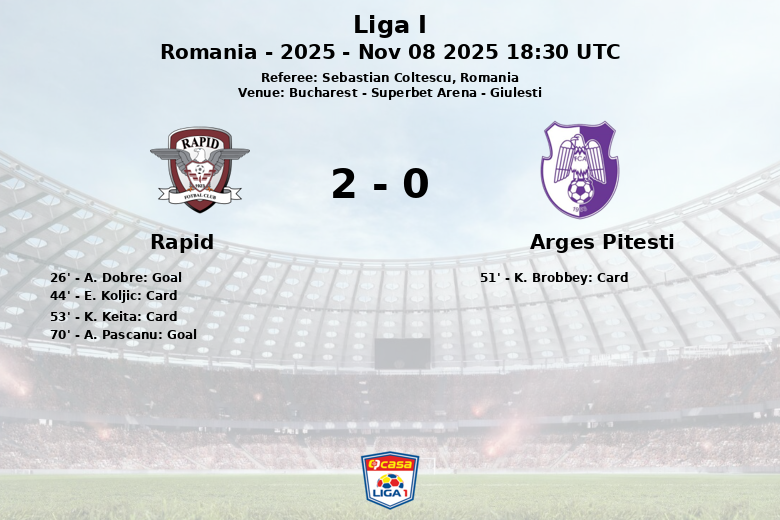 Rapid Bucuresti secured a home victory against Arges Pitesti in a match corresponding to the 16th round of the Romanian Liga I. The game, played at the Superbet Arena – Giulesti in Bucharest, ended with a 2-0 score in favor of the home team.