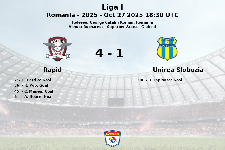 After the restart, Rapid did not ease off their attack, and A. Dobre, assisted by L. Gojkovic, scored the fourth goal in the 61st minute. While Unirea Slobozia managed to pull one back in the 90th minute thanks to R. Espinosa, assisted by P. Dulcea, the goal was merely a consolation.