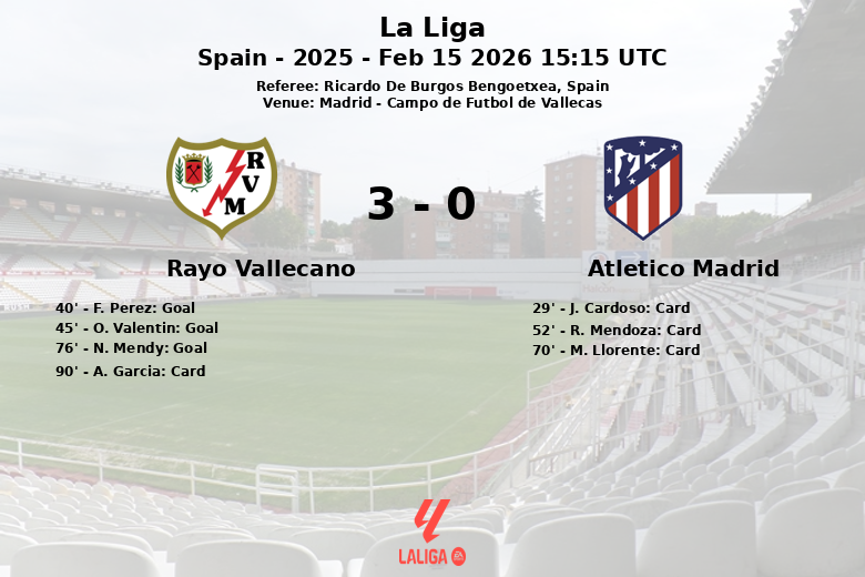 In the second half, Rayo Vallecano continued to press and found the third goal in the 76th minute, scored by N. Mendy, after an assist from A. Garcia. Atlético de Madrid, although trying to react, was outmatched by the intensity and organization of the home team.
