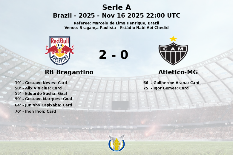 The score was opened in the 55th minute with a goal by Eduardo Sasha, assisted by Juninho Capixaba, giving Bragantino the lead. Shortly after, in the 59th minute, Gustavo Marques extended the difference with a goal assisted by Jhon Jhon. Atlético-MG failed to respond to the home team’s offensive, and the match concluded with a victory for RB Bragantino. Although Atlético-MG had more corners (7 against 3), they failed to capitalize on them.
