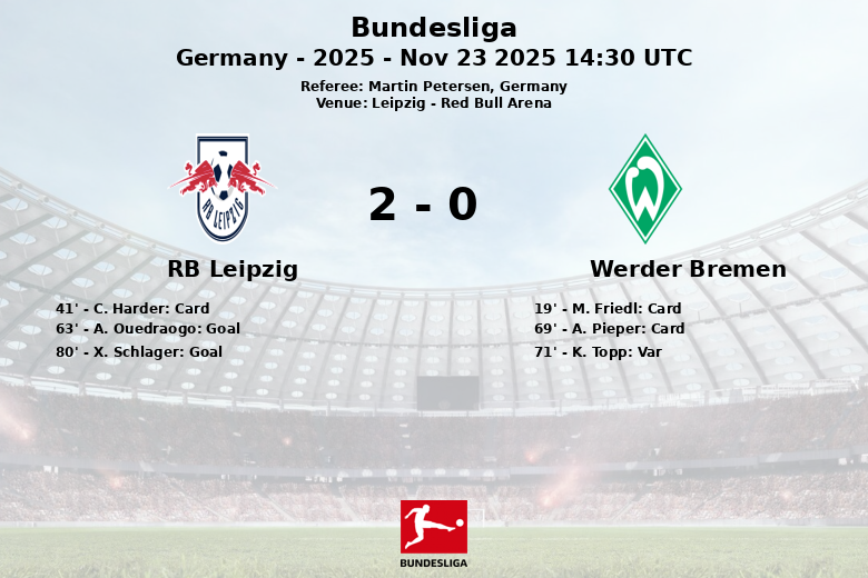 Leipzig’s dominance materialized in the second half. In the 63rd minute, Amadou Ouedraogo opened the scoring with a goal, assisted by Ridle Baku. Werder Bremen tried to react, and a goal by Kyu-hyun Topp was disallowed by VAR in the 71st minute due to offside. The definitive blow came in the 80th minute, when Xaver Schlager scored the second goal for Leipzig, assisted by Christoph Baumgartner, sealing the victory for the home team.