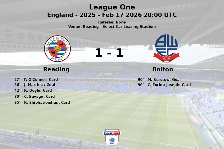 Reading and Bolton Wanderers played to a draw in a tightly contested match at the Select Car Leasing Stadium. Despite holding only 33% of the possession, Reading took the lead in the 36th minute with a goal by J. Marriott, assisted by C. Savage. Bolton, dominating possession with 67% and outshooting Reading in total shots (16 to 6), couldn’t convert until stoppage time. The match was marked by high intensity, reflected in the numerous fouls (15 by Reading and 9 by Bolton) and yellow cards shown to Reading (O’Connor, Doyle, Savage, Ehibhatiomhan). Bolton finally secured the equalizer in the 90th minute with a goal from M. Burstow, assisted by R. Rodrigues. Despite their efforts, Reading couldn’t hold onto their lead, leaving a bittersweet feeling with their fans. Bolton also received a yellow card at the 90th minute to the player C. Forino-Joseph.