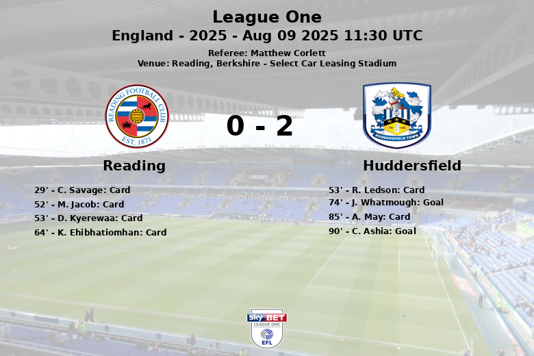 Reading, Berkshire – In a League One encounter held at the Select Car Leasing Stadium, Huddersfield Town secured a victory against Reading in a closely contested match that culminated in a score of two to zero. Despite Reading holding 48% of the possession, Huddersfield demonstrated greater effectiveness in front of goal, dominating the goal-scoring opportunities with 12 total shots, 6 of which were on target, compared to Reading’s 6 shots (2 on target and 4 off target). Huddersfield also surpassed Reading in corner kicks with 10 versus 3.