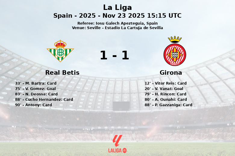 Girona took the lead in the 20th minute thanks to a goal by V. Vanat, assisted by B. Gil. Betis, despite their territorial dominance, couldn’t convert their numerous attacks until the 75th minute, when V. Gomez, assisted by Isco, managed to equalize.