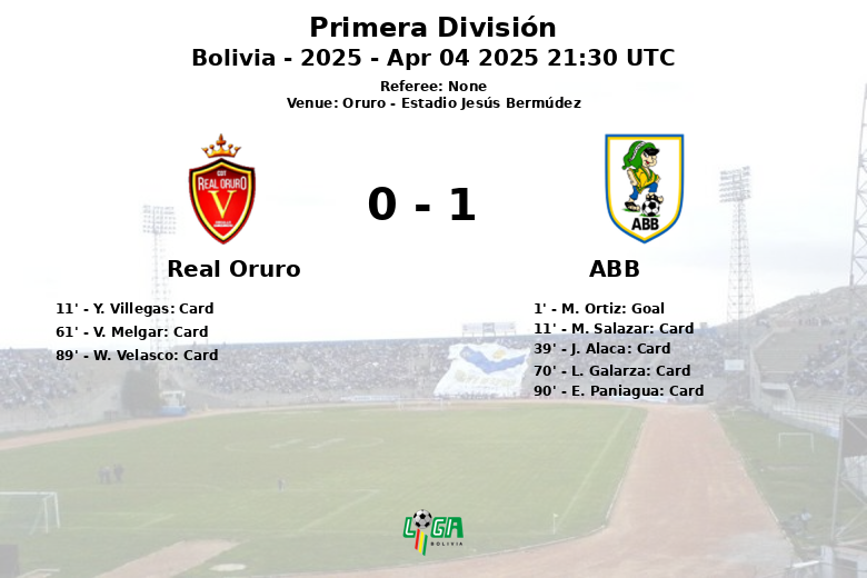 ABB edged out Real Oruro in a hard-fought match at the Estadio Jesús Bermúdez in Oruro. The game, part of the second round of the 2025 Bolivian Primera División season, ended with a narrow 1-0 victory for ABB. The match was decided early with an own goal by Real Oruro’s M. Ortiz in the 1st minute. Despite Real Oruro’s superior possession (65%), ABB defended effectively and capitalized on their chances. Real Oruro created more goal-scoring opportunities (16 shots, 5 on target), but ABB proved more clinical. The match was a tense affair, with a total of 33 fouls (17 by ABB and 14 by Real Oruro), and five yellow cards (2 for Real Oruro and 4 for ABB) and a red card for Real Oruro’s V. Melgar in the 61st minute. Although Real Oruro dominated possession and shots, ABB secured the win thanks to a strong defense and efficiency in front of goal.