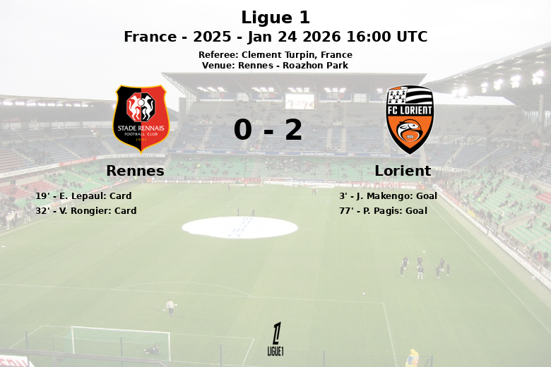 Rennes, France – In a match held at Roazhon Park, Lorient pulled off an upset by defeating Rennes with a final score of 2 to 0. The match, valid for matchday 19 of Ligue 1, saw Lorient take an early lead thanks to a goal by J. Makengo in the 3rd minute, assisted by M. Talbi.