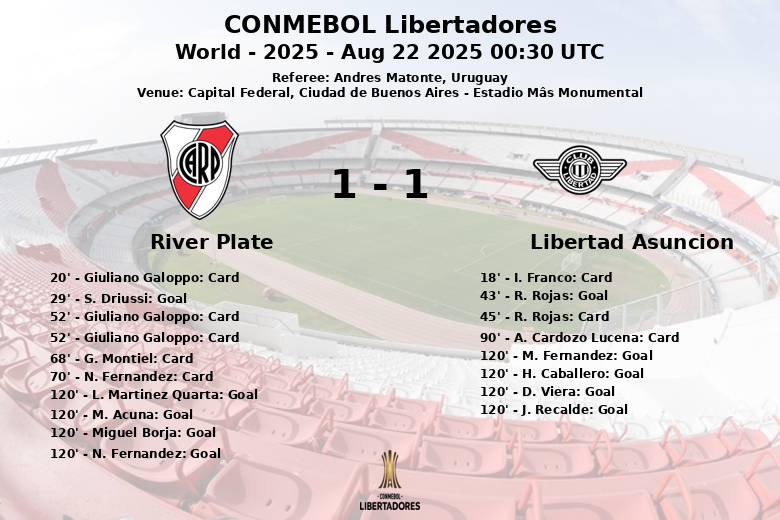 Regarding statistics, River Plate dominated possession with 60%, attempting 15 shots (6 on target) and earning 2 corners. Libertad, meanwhile, had 40% possession, with 17 shots (8 on target) and 6 corners. The match had a total of 25 fouls, 7 yellow cards, and 1 red card.