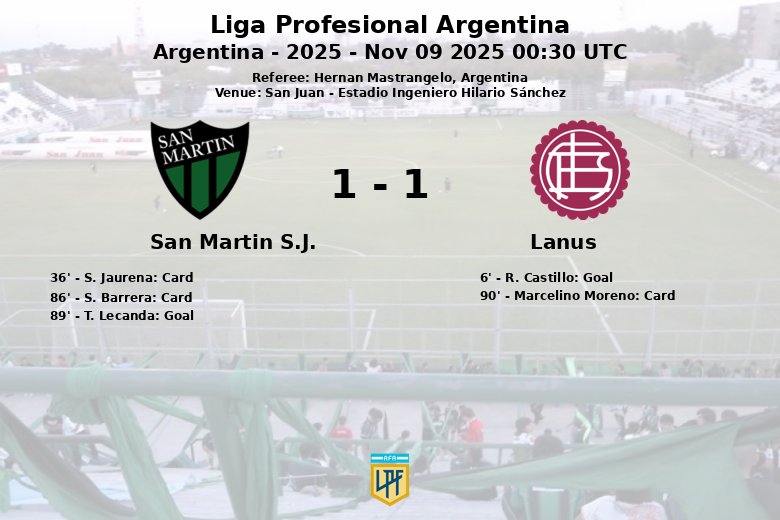 In the final minutes, San Martín managed to equalize in the 89th minute with a goal by T. Lecanda. Despite the efforts of both teams, the match ended in a draw. Marcelino Moreno of Lanus received a yellow card in the 90th minute and S. Barrera from San Martin S.J. in the 86th.