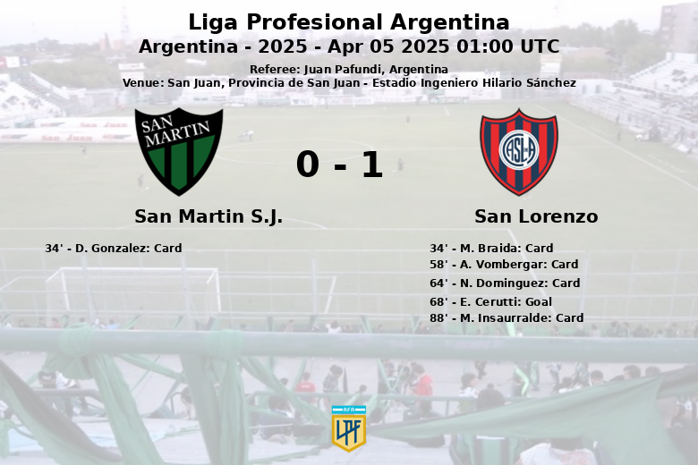 San Lorenzo edged out a narrow victory against San Martín de San Juan at the Estadio Ingeniero Hilario Sánchez. The match, part of round 12 of the 2025 Argentine Professional League’s First Phase, was played on April 5th in San Juan and officiated by Juan Pafundi. Despite fewer shots on target (5 vs 3), San Martín de San Juan controlled 46% of the possession, compared to San Lorenzo’s 54%. However, San Lorenzo proved more clinical. The only goal of the game came in the 68th minute, courtesy of Ezequiel Cerutti. The match was fiercely contested, with 17 fouls committed by San Lorenzo and 13 by San Martín. Both teams received yellow cards: one for San Martín and four for San Lorenzo. Despite a valiant effort from the home side, San Lorenzo secured all three points.